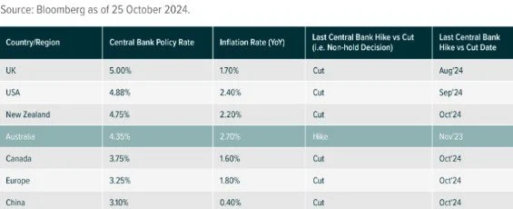 While global interest rates increased in unison in response to rising inflationary pressures in 2022 and 2023, the pathway to lower rates may not be as synchronised. As US Federal Reserve Chair Jerome Powell remarked at the Jackson Hole Symposium in August this year, “The time has come for policy to adjust”. Yet, as we approach the end of 2024, the expected pace of interest rate cuts and the extent of easing varies across major economies. Although there is a degree of uncertainty, investors may look to Australian bonds to provide some compelling opportunities as they navigate shifting global monetary dynamics.